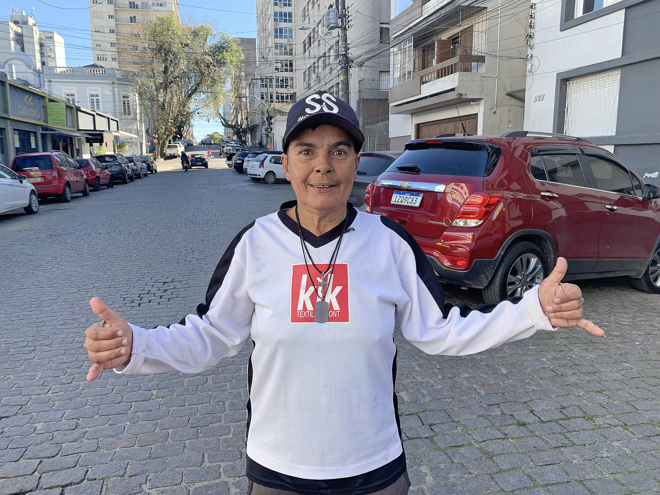 Eu sempre morei em Pelotas. Meus pais trabalharam com os Assumpção, depois trabalharam com os Oliveira, e aí se aposentaram. Meu pai é falecido, minha mãe também e moro na casa deles. Temos nove irmãos, mas três já são falecidos. Por enquanto, onde morar eu não tenho, mas vivo lá. E aqui o pessoal já me conhece, porque estou aqui há 28 anos. Então, procuro estacionar os carros direitinho, procuro tratar todo mundo bem. Se por acaso o pessoal não quiser colaborar comigo ou coisa assim, também não obrigo nem nada. Porque, na verdade, o meu serviço é mais lavar carro. Eu lavo muito carro. No momento, estava parado por causa dessas enchentes. Mas se o tempo continuar bom, consigo meu dinheiro, graças a Deus, trabalhando aqui nessa quadra.