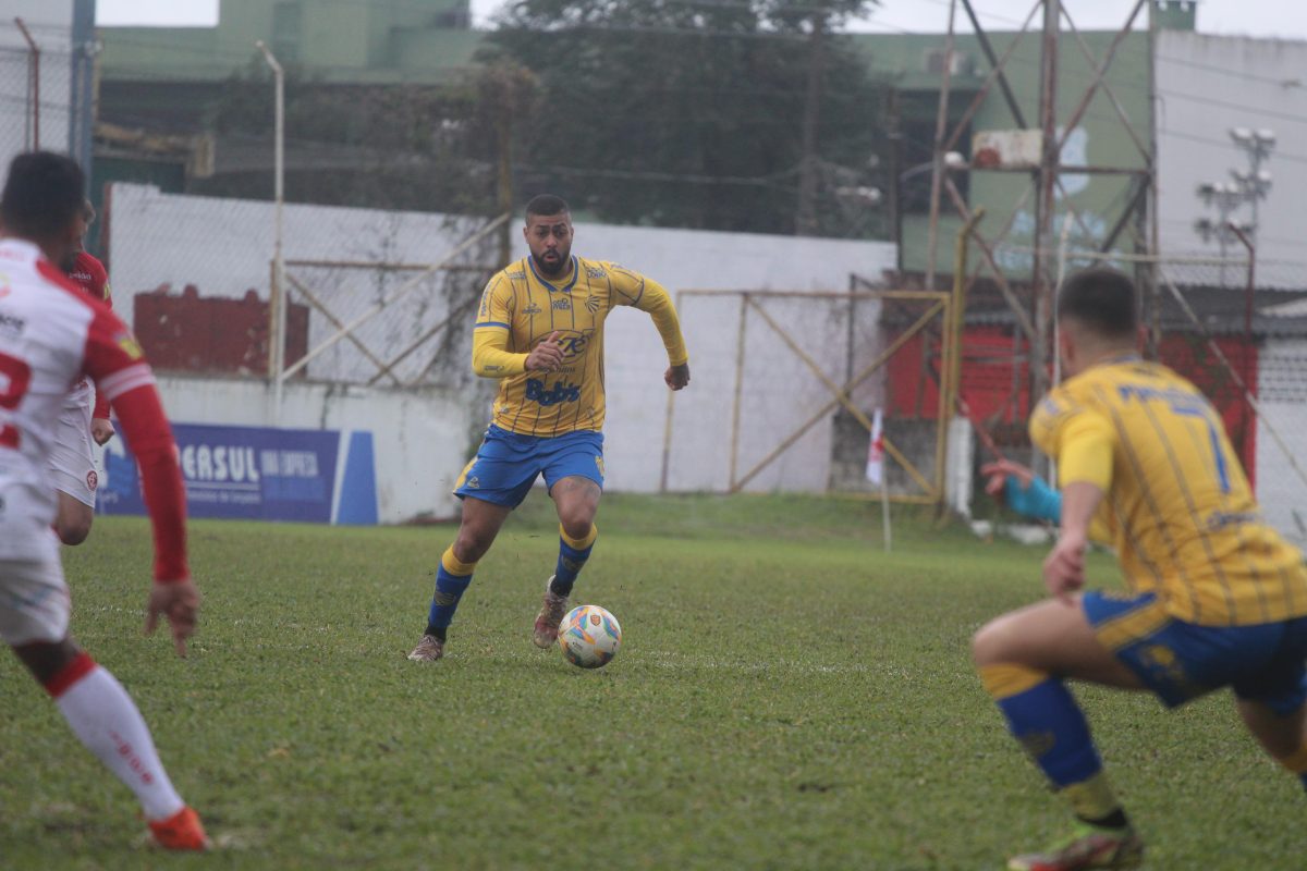 O Pelotas terminou a etapa inicial em um cenário delicado. Aos 39 minutos, Mateus Santana, volante com passagem pelo Lobo entre 2019 e 2020, cabeceou no canto esquerdo de Allan Thiago após cobrança de escanteio e abriu o placar. O gol nasceu do tipo de lance mais propício para o gramado, em péssimo estado depois da enchente de maio.