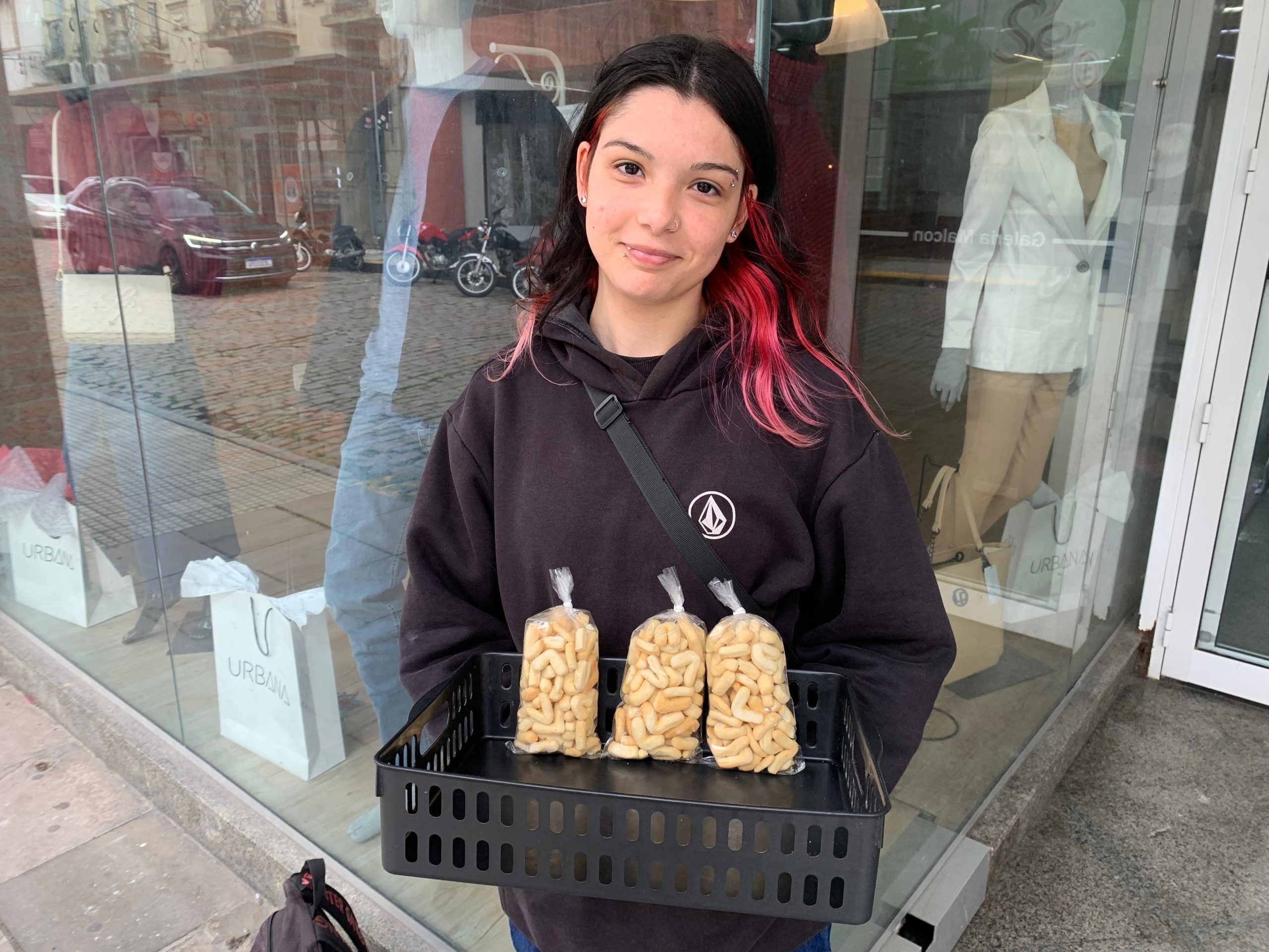 Sou natural daqui de Pelotas. Eu estudo, estou no segundo ano do Ensino Médio no colégio Pedro Osório. Vendo biscoitos para ter um dinheiro, é um trabalho mesmo, para comprar as minhas coisinhas. O meu primo veio de Porto Alegre para cá e já trabalhava nisso, só que ele vendia brigadeiro. Agora, com 18 anos, achei outras coisas para vender. Fui vendendo coisas diferentes e achei o biscoito bem mais fácil. Meus pais me apoiam nisso, eles me ajudaram desde o início. Me ajudaram a comprar os primeiros biscoitos, e agora que estou por mim mesma.