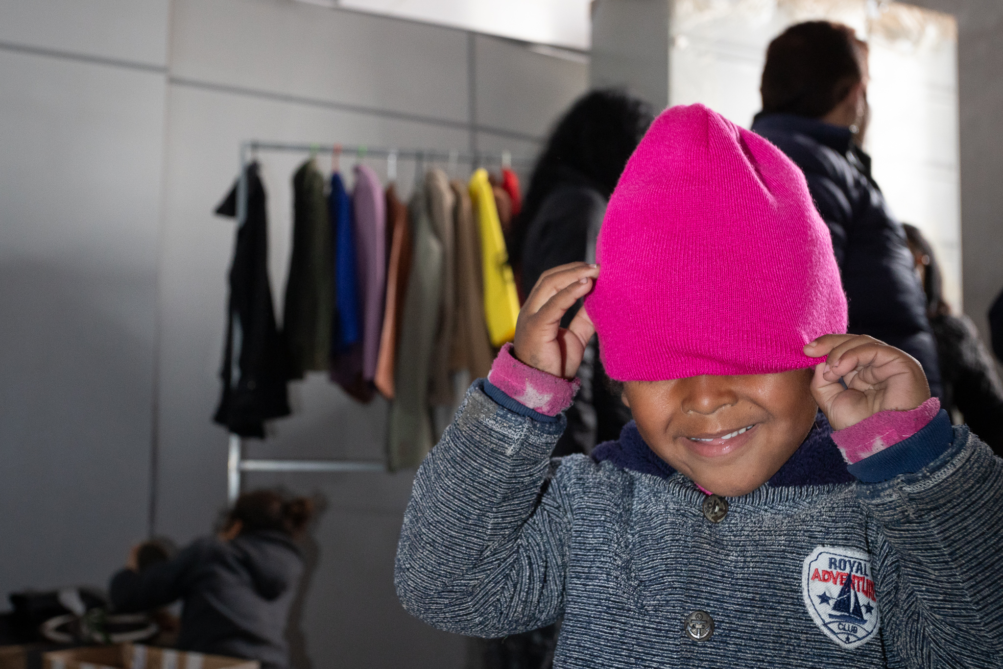 No espaço reservado para o brechó, as peças são separadas por tamanho. Nas araras ficam os casacos de inverno. Nos cestos, mantas e toucas.