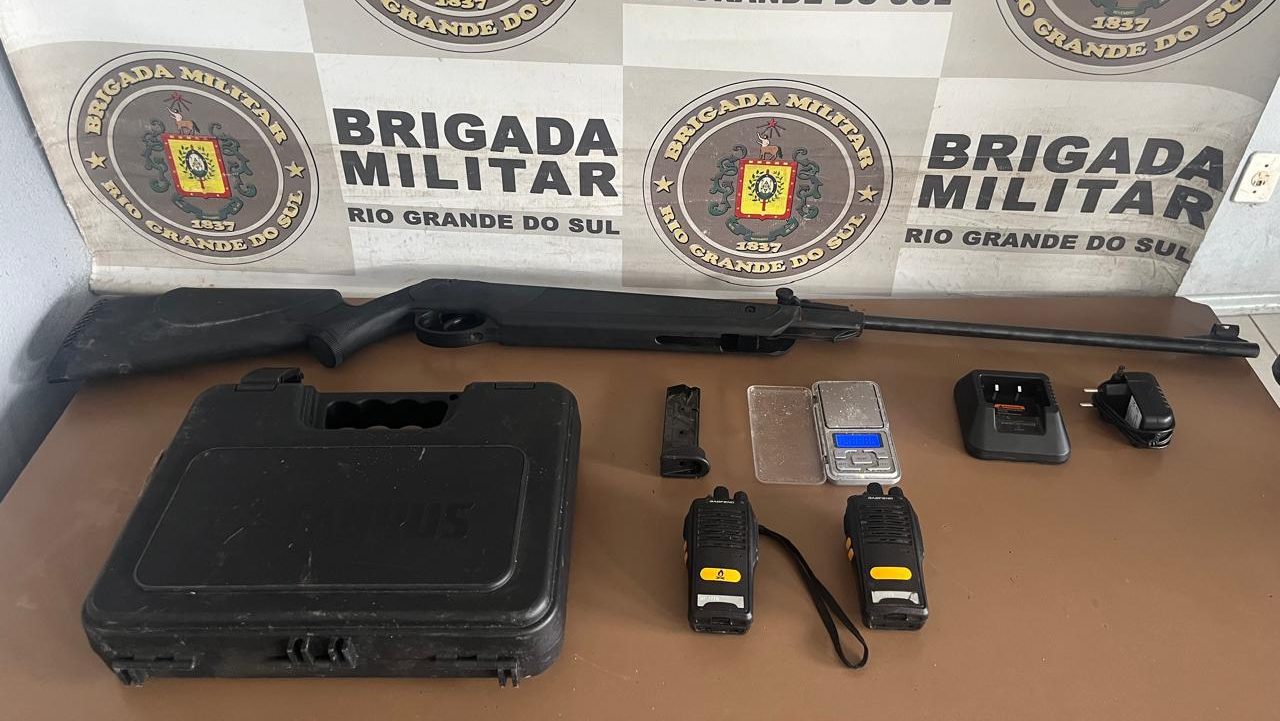 Foram apreendidos uma espingarda calibre 22, um carregador de pistola calibre 9mm, dois rádios comunicadores com base para carregamento e uma balança de precisão.