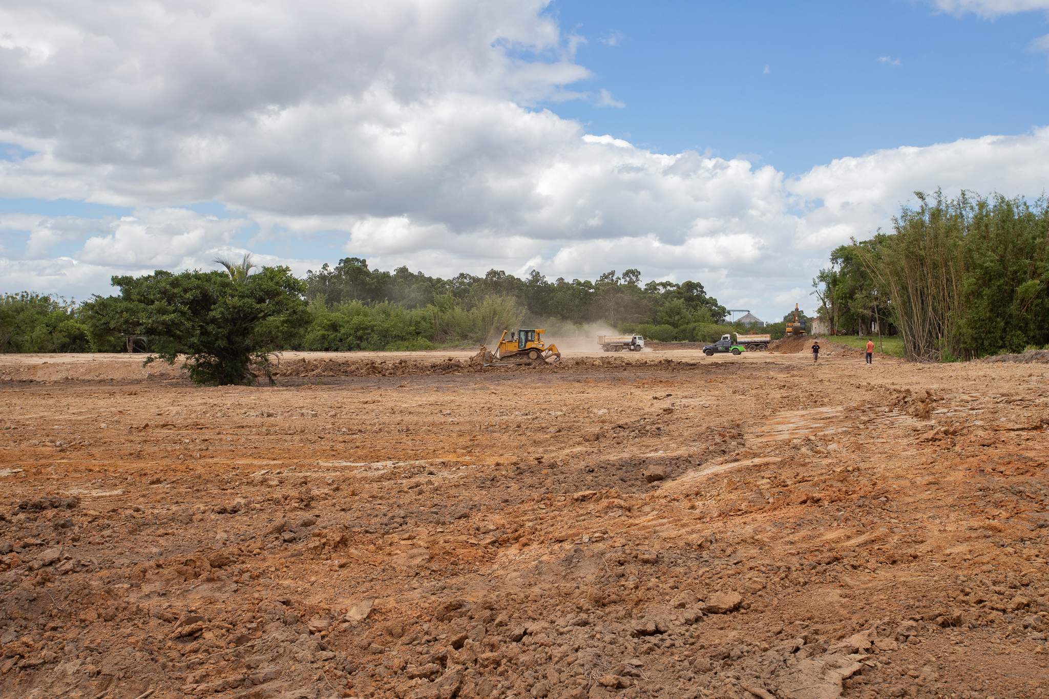 O terreno de quatro hectares está localizado na avenida 25 de Julho, próximo à rótula com a BR-116. Uma placa indica que o licenciamento ambiental emitido pela prefeitura é válido por dois anos, até 21 de novembro de 2026. Após o pórtico de entrada ficará um estacionamento; atrás, o estádio e, ao fundo, um centro de treinamento.