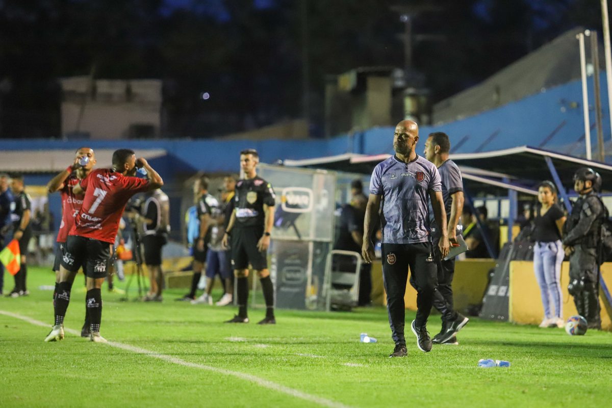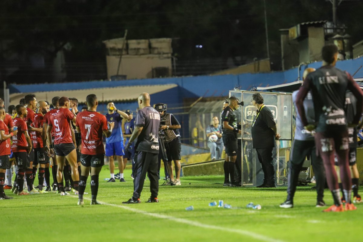 Dono da casa, o Lobo tinha mais posse de bola e tomava a iniciativa. Mas as perseguições individuais dificultavam, por exemplo, as aparições de Cesinha, cuidado de perto por Rael. Esse cenário tático mudou com meia hora de clássico. Aos 27 minutos, Guilherme Cerqueira deu carrinho em Michel Douglas. No VAR, Rodrigo Brand da Silva orientou revisão do lance no monitor. Echevarria decidiu expulsar o zagueiro rubro-negro.