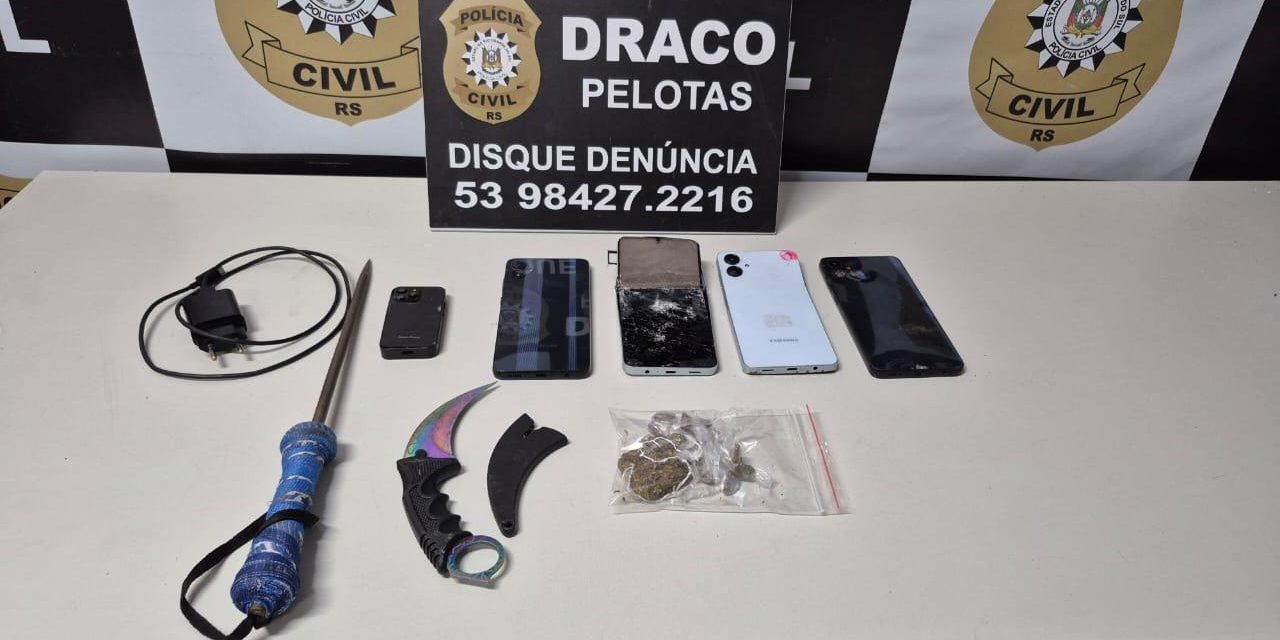 A investigada foi presa em sua casa, e, em relação a seu companheiro, foi cumprido mandado de busca e apreensão em sua cela no presídio regional de Pelotas, com apoio da Polícia Penal, sendo apreendidos telefones celulares, porções de drogas, e armas brancas.