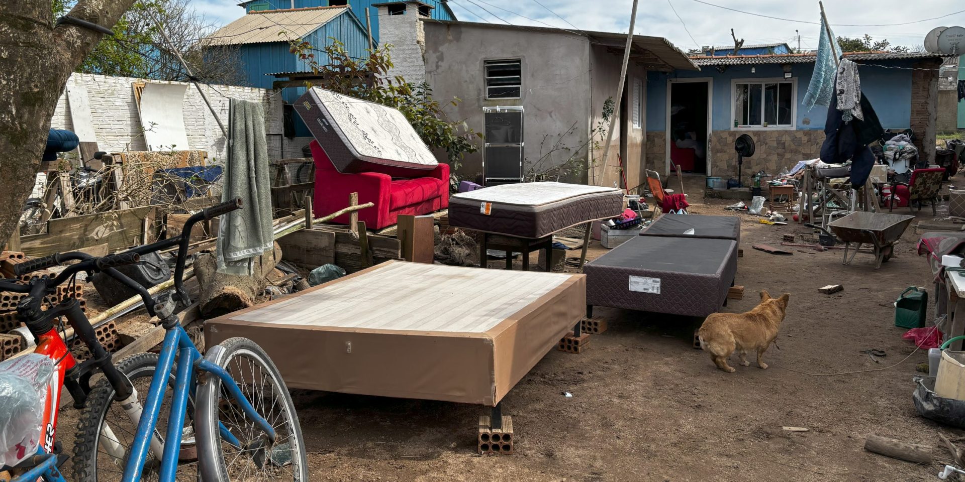 A família precisou sair às pressas e se abrigou na casa da irmã de Fabiane, que também teve o pátio alagado. Agora, o esforço é para levantar móveis, limpar e tentar salvar o que restou. “Os colchões, a maioria, conseguimos botar no alto. Mas o da minha guria, da minha mãe, ficou banhado na água. Consegui dois colchões pra ela, que a prefeitura trouxe. As roupas não deram tempo de tirar, ficaram todas debaixo d’água.”