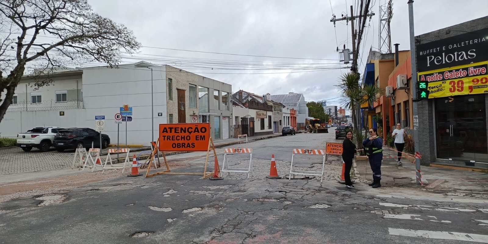 A obra de drenagem que vem sendo realizada há mais de dois meses na rua Gonçalves Chaves, em Pelotas, provoca um bloqueio total no trecho entre a avenida Bento Gonçalves e a rua Doutor Amarante, na manhã desta quarta-feira (1º). Segundo o supervisor da obra, a intervenção deve se estender até sábado (4), com fechamento durante o dia e liberação no período da noite.