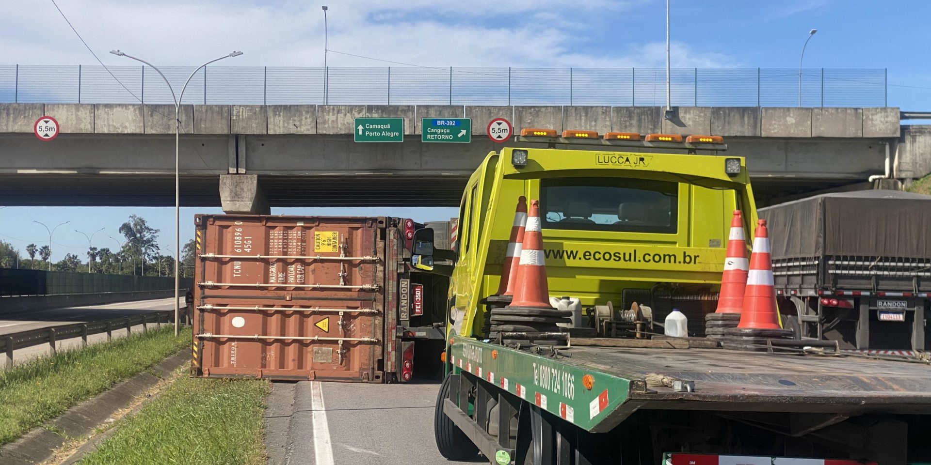 Uma carreta tombou km 524 da BR-116, nas proximidades da alça de acesso a Pelotas/Fenadoce, na tarde desta quarta-feira (22). As equipes da Ecovias Sul fizeram o atendimento.