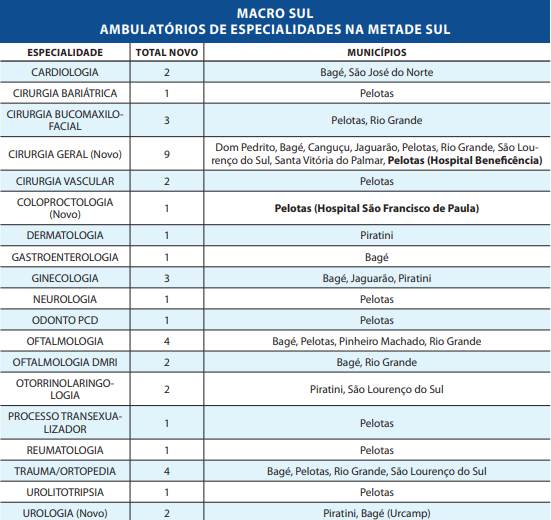 Na 3ª CRS, em Pelotas, foram habilitados dois novos ambulatórios – um de cirurgia geral, na Beneficência Portuguesa, e outro de coloproctologia, no Hospital Universitário São Francisco de Paula – enquanto a 7ª CRS, em Bagé, ganhou um na especialidade de urologia, na Urcamp.