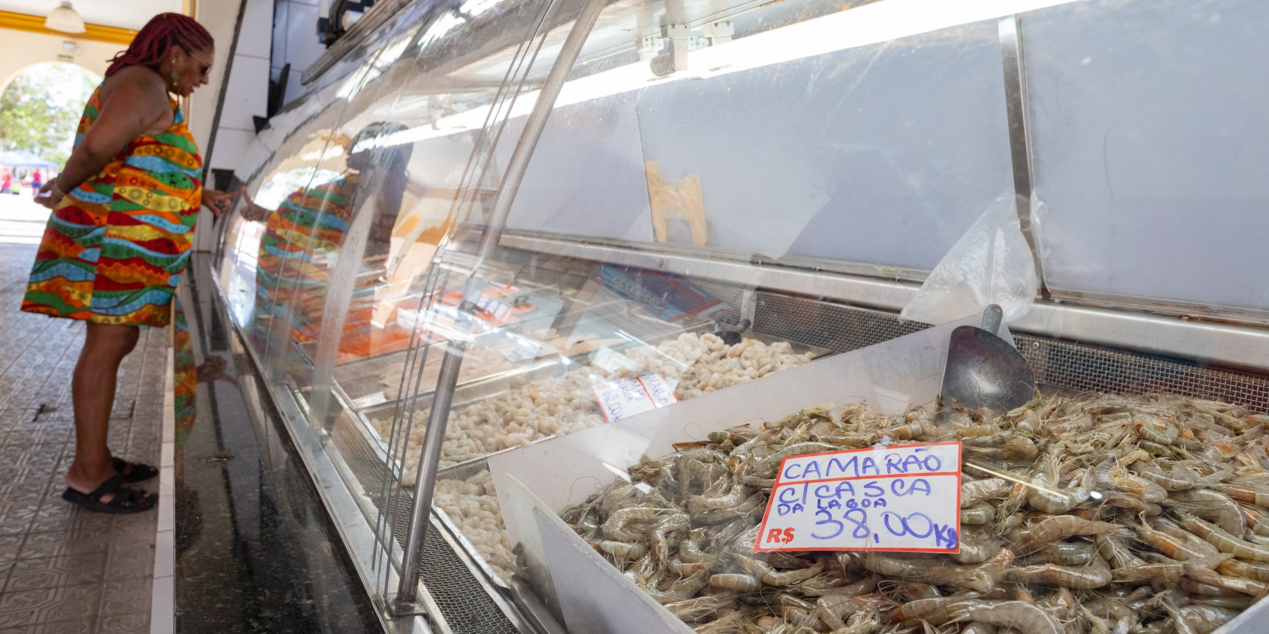 Já na banca de Clarice Fonseca, os crustáceos foram trazidos do Rio Grande e também se encaixam no tamanho médio, sendo vendidos limpos ou com casca. “Temos buscado camarão lá. A expectativa é que neste fim de semana melhore um pouco. Há previsão de uma onda de calor, e isso ajuda bastante”, explica.