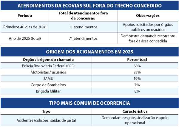 Um levantamento da Ecovias Sul mostra que a concessionária realizou 71 atendimentos fora do trecho sob concessão ao longo de 2025, o que representa uma média aproximada de uma ocorrência a cada cinco dias. Nos primeiros 40 dias de 2026, já foram 11 apoios solicitados por órgãos públicos ou usuários em rodovias sem cobertura contratual.