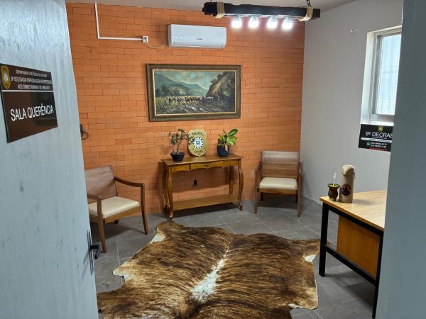 Um dos diferenciais da Decrab Rio Grande será a criação da Sala Querência, espaço voltado ao acolhimento dos produtores rurais para registro de ocorrências. O ambiente será caracterizado em estilo tradicionalista gaúcho, buscando aproximar a estrutura policial da realidade do campo.