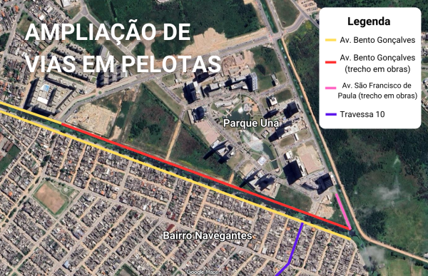 Segundo o secretário de Urbanismo de Pelotas, Otávio Peres, a execução do projeto não é realizada diretamente pelo município, mas pelos próprios empreendedores responsáveis pelos loteamentos instalados na região. A ampliação da Bento Gonçalves está vinculada aos compromissos urbanísticos assumidos por esses empreendimentos.