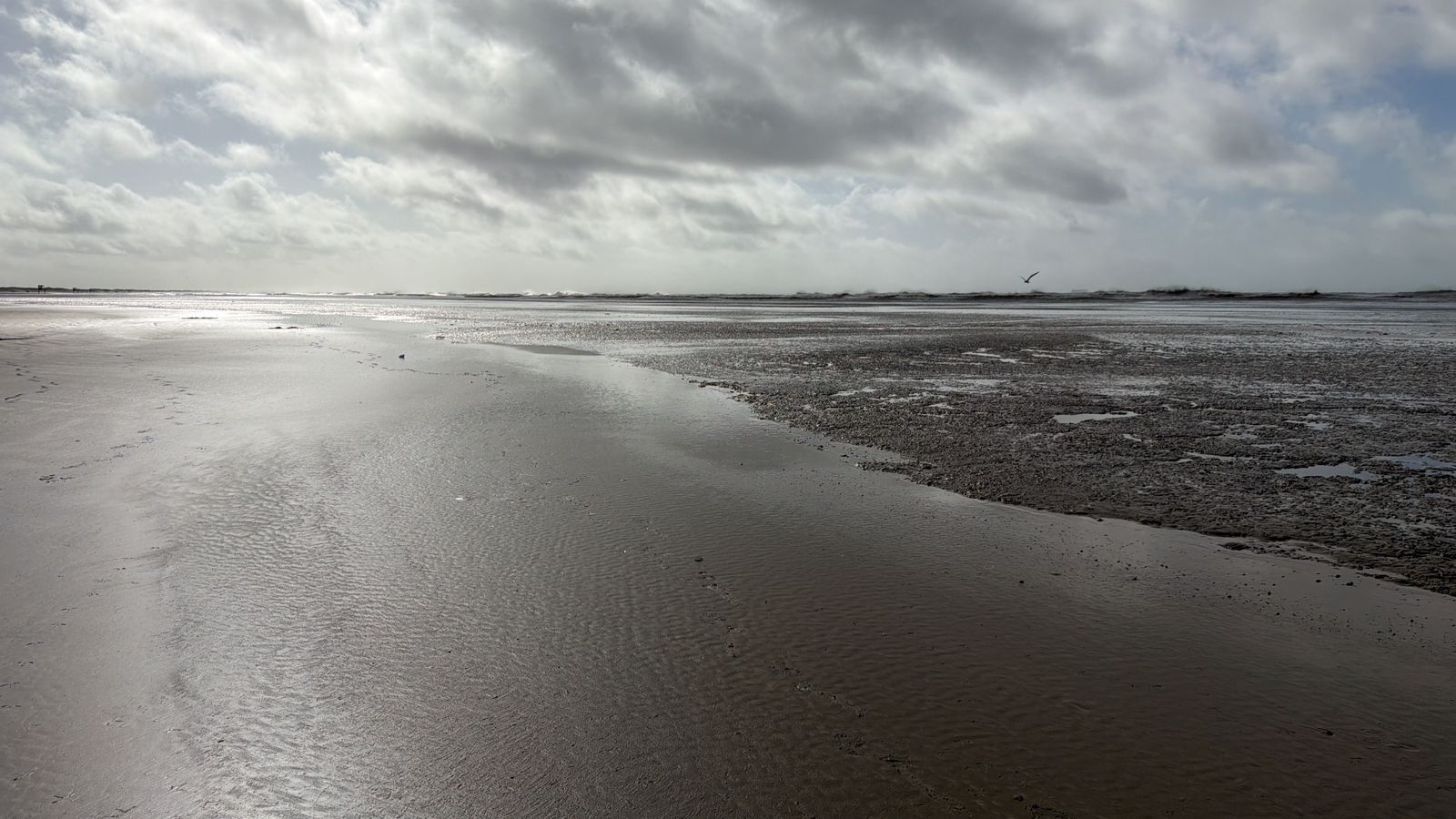 A praia do Cassino, em Rio Grande, amanheceu nesta quinta-feira (9), com uma extensa camada de lama sobre a areia. O trecho compreende boa parte da orla, chegando às proximidades das dunas em alguns pontos. O fenômeno seria consequência da atuação do ciclone extratropical nos últimos dias na região, onde os fortes ventos podem ter causado a suspensão do sedimento. A situação já estaria sendo monitorada pela autoridade portuária.