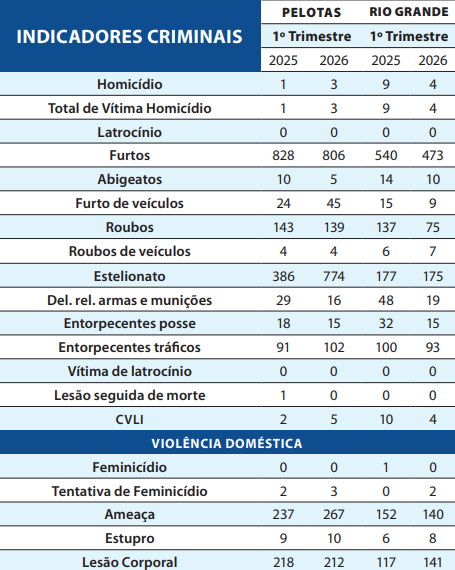 Os indicadores da criminalidade divulgados pela Secretaria de Segurança Pública do Estado apontam um trimestre menos violento nas duas principais cidades da região Sul, exceto para os casos de estelionatos, que dobraram em Pelotas. O balanço é de cenários distintos. Enquanto Rio Grande apresenta queda nos crimes letais e contra o patrimônio, Pelotas acende um sinal de alerta sobre golpes e furtos de veículos.