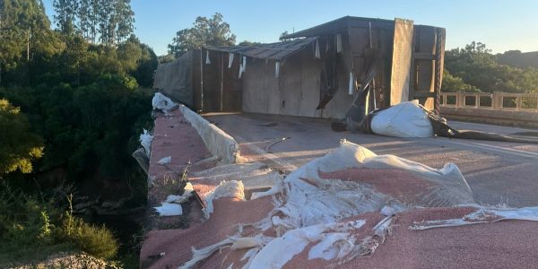 Uma carreta – que a princípio estaria carregada de cloreto – tombou na manhã desta segunda-feira (27) na ponte do Areião, na BR-392, entre os municípios de Canguçu e Santana da Boa Vista.